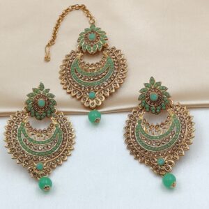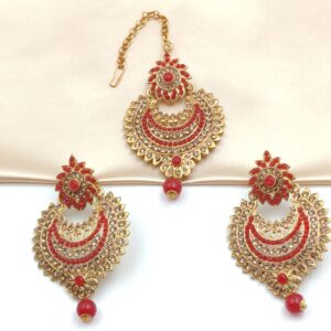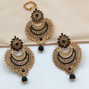 “Traditional Kundan & Pearl Chandbali Earrings with Maang Tikka Set. Wear it with a suit or a saree, and lehenga for an ethnic yet classy look.