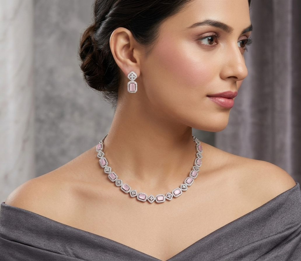 Elegant American Diamond geometrical pattern pink Necklace Set-Designer Jewelry Set with Earrings is Stunning & Preciously Suitable for all kinds of occasions. Top Quality/long lasting/ Latest Trend Design.White Rhodium Plated for High Durability. Ideal wear & gift for all occasions.