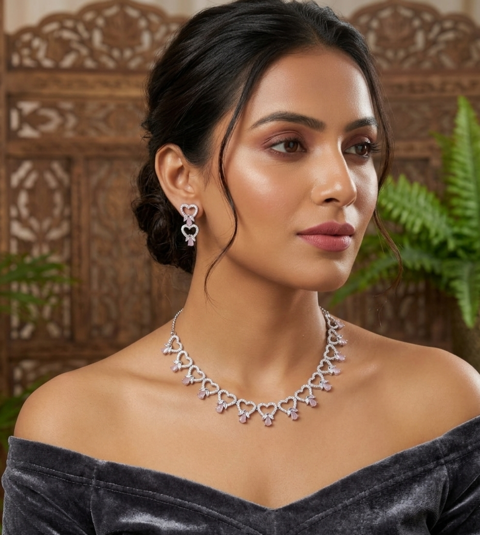 Elegant American Diamond heart shaped light pink Necklace Set-Designer Jewelry Set with drop Earrings is Stunning & Preciously Suitable for all kinds of occasions. Top Quality/long lasting/ Latest Trend Design. White Rhodium Plated for High Durability. Ideal wear & gift for all occasions.
