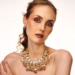 STYLE: Kundan Choker with american diamond finishing around the colored stone featuring oval shape which is further embellished with big kundan & semi precious stones. Necklace comes along earrings & maangtikka. Adjustable neckband. Premium Quality. Rarely available online. For modern/Traditional & Fusion.