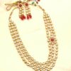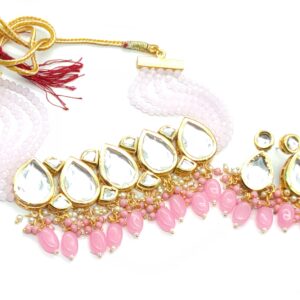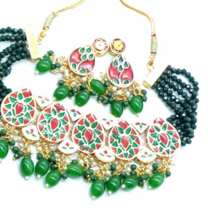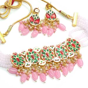STYLE: Ethnic Choker Jewelry Set Featuring oval shape meenakari choker which is further embellished with big kundan & Pearl beads with semi precious stones. Necklace comes along earring & maangtikka. Tussle beads around the neck. Meenakari on the back.