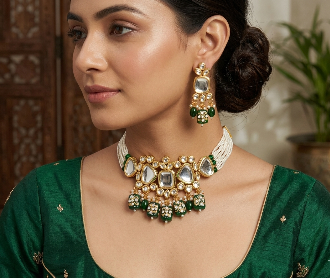 STYLE: Ethnic Choker JewelRY Set Featuring oval shape meenakari choker which is further embellished with big kundan & Pearl beads with semi precious stones. Necklace comes along earring & maangtikka. Tussle beads around the neck. Meenakari on the back.