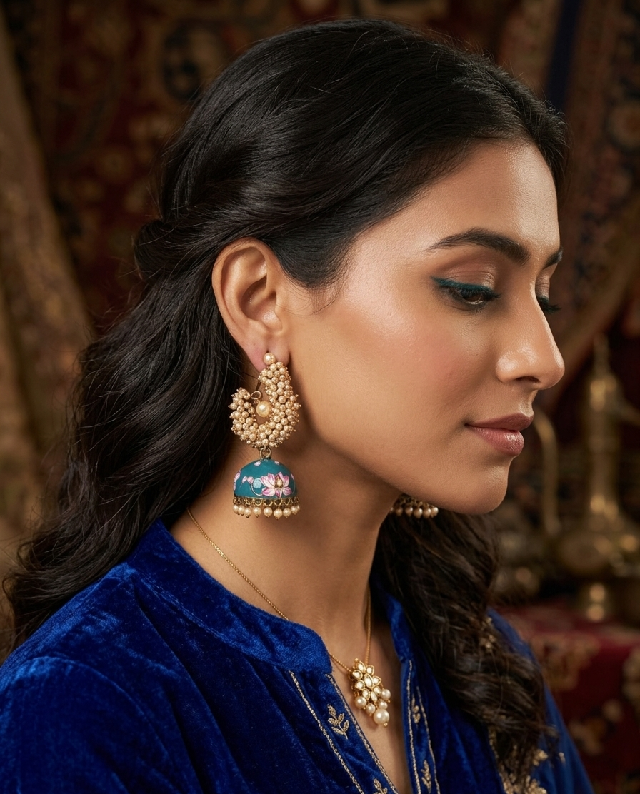 Floral Enamel(Meenakari) Hoop Style Jhumki Earrings. Size: Length 8 cm & Width 2.8cm. Handmade finish, high quality, long lasting. Pearl beads are closely handcrafted to give a perfect traditional ethnic look.
