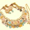 STYLE: Kundan Multi color Choker with american diamond finishing around the colored stone featuring oval & square shape which is further embellished with big kundan & semi precious stones. Necklace comes along earrings & maangtikka. Adjustable neckband. Premium Quality. Rarely available online. For modern/Traditional & Fusion.