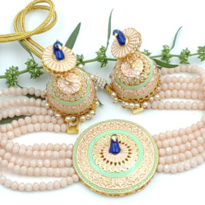 Choker Set With Meenakari & Pearl featuring green-blue combination with light pink/peach/grey base.