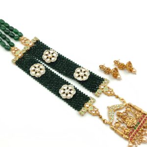 Semi precious Green Emerald Onyx Stone Beads Necklace band with jaal made with beautiful decorative glossy beads, Kundan crystal stones highlighting jaal with hooks at the end. Best used for gold pendants. For multipurpose use. Hand-painted and handcrafted with gold finish. Best in quality.